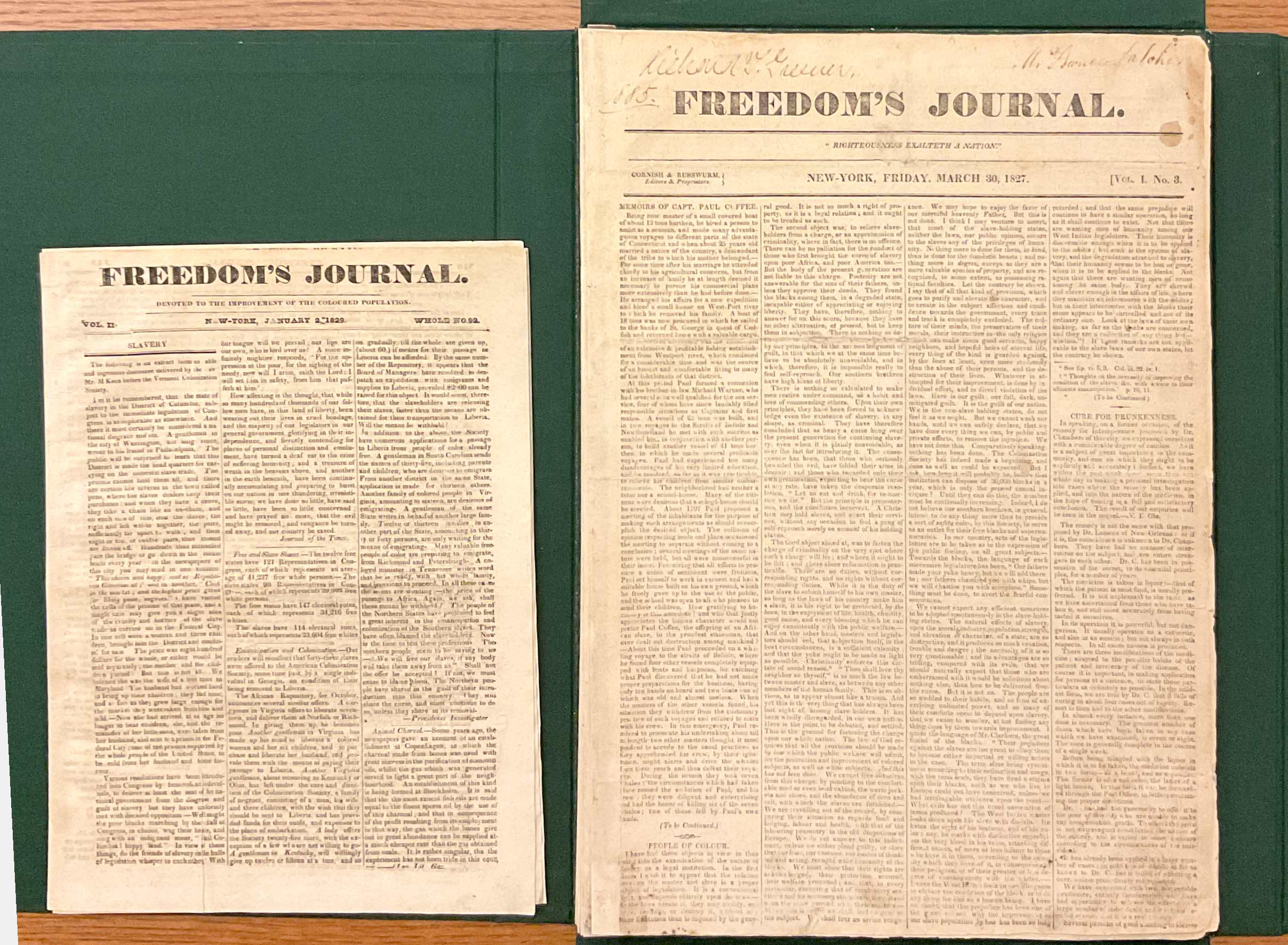 The project’s resulting monograph is titled Reading Between the Lines: Meaning and Mediality in Freedom’s Journal, which the University of Pennsylvania Press will publish in spring 2027. The book argues that Freedom’s Journal created provocative meaning not simply through its direct, expository texts (as scholars have already shown), but equally—and often more radically—through its content-medium relationship. Chapter 1 argues that the visuality of Freedom’s Journal was intimately linked to its projects of African American citizenship, thus telling a new narrative of Freedom’s Journal as a cultural institution attempting to balance economic concerns with socio-political ambitions, material constraints with medial expectations, editorial frustrations with audience appetites. Chapter 2 demonstrates how the Journal’s reprinting practices provided safe channels for engagement with revolutionary political thought. Chapter 3 explores the relationships between discrete printed items placed in spatial proximity to one another on or across the pages of Freedom’s Journal, asserting that this phenomenon produced a dialogic environment in which texts challenged, affirmed, and informed one another, ultimately producing an effect greater than the sum of each individual text. Knowing that the Journal was used pedagogically, Chapter 4 thinks through Freedom’s Journal as a learning tool focused on deconstructing white, Western hierarchies of power and oppression through unassuming texts and genres.